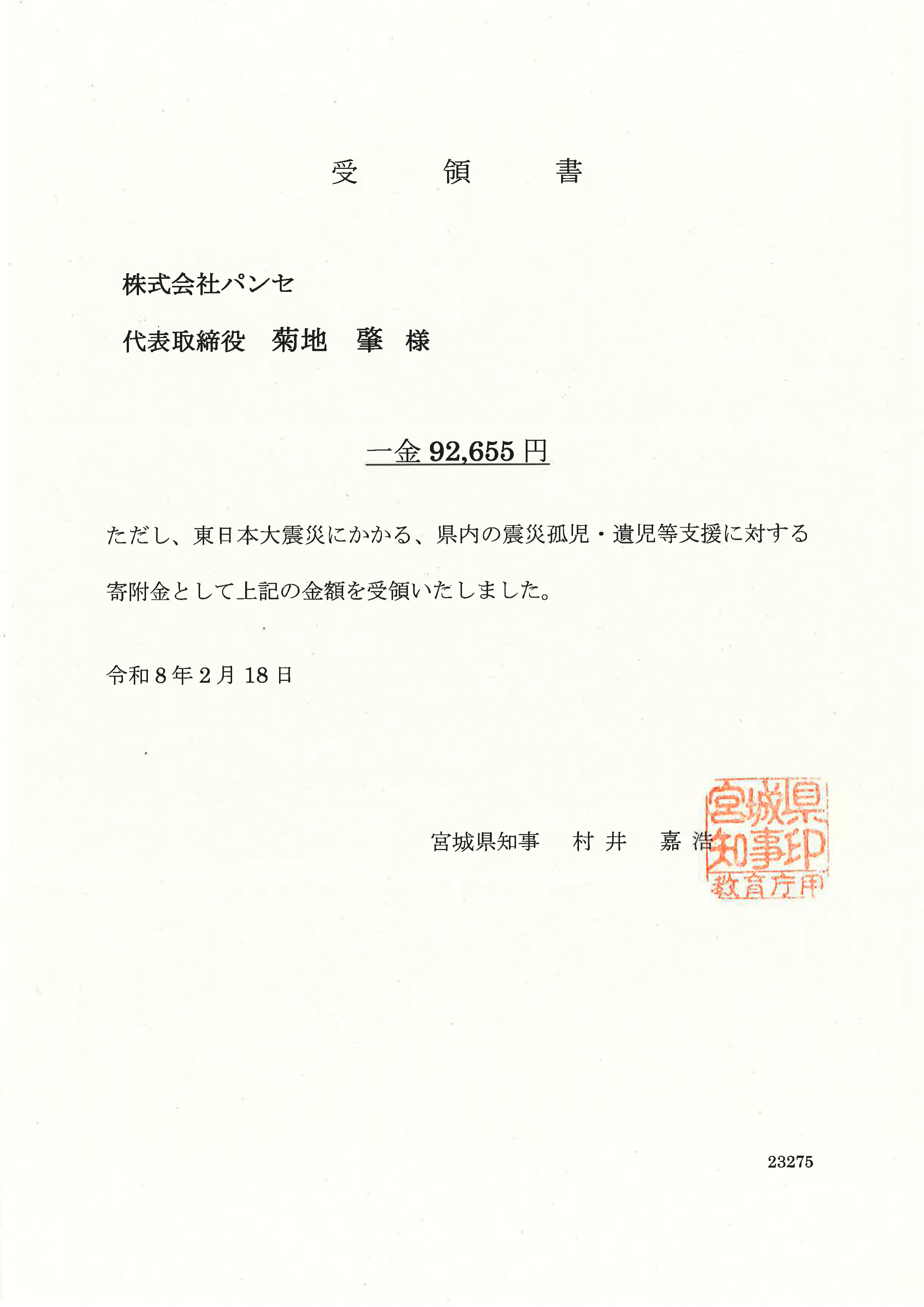 宮城県へ【東日本大震災みやぎこども育英募金】として寄付しました
